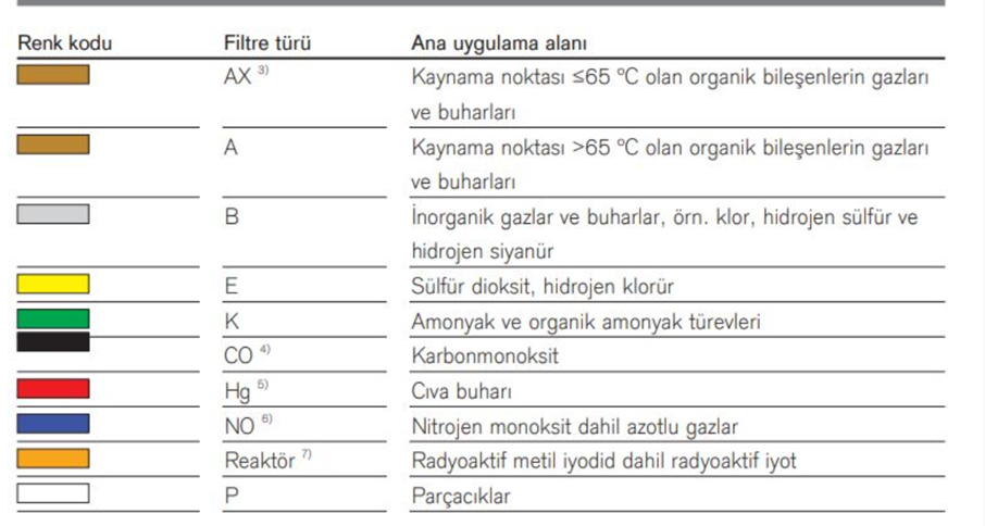 - ya da CO tutma özelliği olan maskeler tercih edilmelidir. Buna göre standart bir gaz maskesi de CO ‘e karşı koruma sağlamayacaktır. (Tablo 1. Solunum koruyucu filtre türü ve koruma özellikleri )