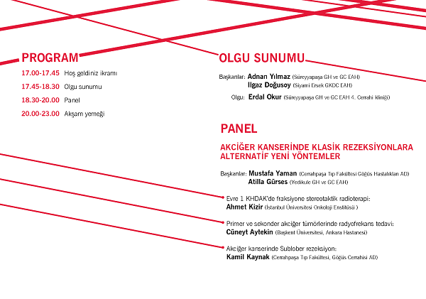 Solunum alanında hem klinik pratikte hem de akademik ortamlarda her zaman birlikte olan ve çalışan iki uzmanlık alanı olarak TÜRKİYE SOLUNUM ARAŞTIRMALARI DERNEĞİ ve TÜRK GÖĞÜS CERRAHİSİ DERNEĞİ İSTANBUL ŞUBESİ Ortak toplantı programı "Bölgesel Toplantılar" bölümünde sunulmuştur.
