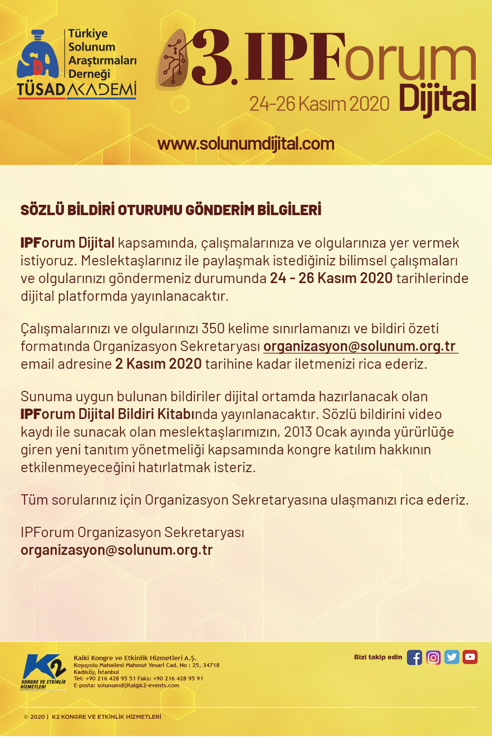 Türkiye Solunum Araştırmaları Derneği'nin bu yıl 3.’sünü düzenlediği İPForum 2020 Dijital 24-26 Kasım 2020 tarihleri arasında Solunum Dijital Online Platformunda gerçekleştirilecektir. Sizleri İPF alanında sürekliliği olan bu sempozyuma davet etmekten mutluluk duyuyoruz.