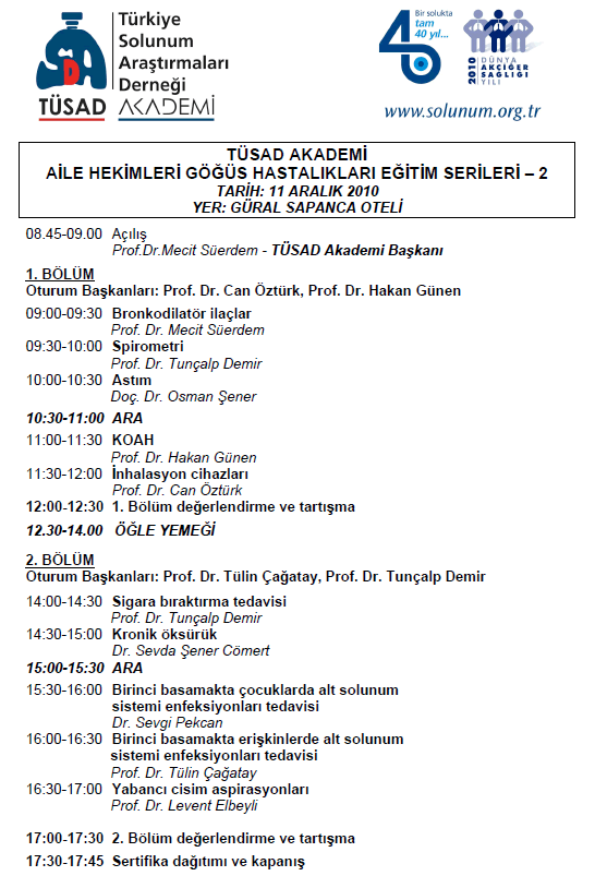 TÜSAD AKADEMİ faaliyetleri kapsaminda AİLE HEKİMLERİ'nin egitimine yönelik olarak gerçekleştirilen "TÜSAD AKADEMI AILE HEKIMLIGI GÖGÜS HASTALIKLARI EGITIM SERILERI "nin 2. Toplantisi 11 ARALIK 2010 tarihinde GÜRAL SAPANCA OTEL'de gerceklestirilecektir. Toplantiya katilim ve diger detaylar hakkinda bilgi almak icin organizasyon sekreterligi ile temas kurmanizi rica ederiz.