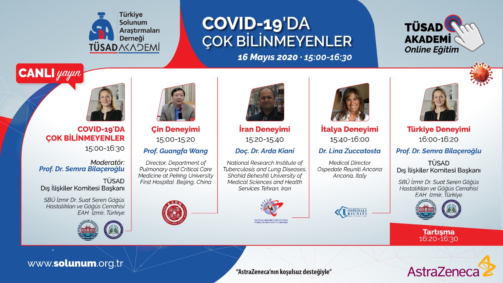 TÜSAD Akademi tarafından düzenlenen, canlı yayın olarak gerçekleştirdiğimiz “COVID 19'da Çok Bilinmeyenler” konulu toplantımız 553 katılımcı ile gördüğü ilgiden dolayı siz değerli üyelerimize, moderatörlük görevini üstlenerek ayrıca Türkiye deneyimlerini bizlerle paylaşan Prof. Dr. Semra Bilaçeroğlu'na, birbirinden değerli yorumlarıyla konuşmacı olarak katılarak Çin deneyimlerini paylaşan Prof. Dr. Guangfa Wan, İtalya deneyimlerini paylaşan Dr. Lina Zuccatosta ve İran deneyimlerini paylaşan Doç. Dr. Arda Kiani'ye ekran karşısında bizlere katılan meslektaşlarımıza bir kez daha teşekkür ederiz.
