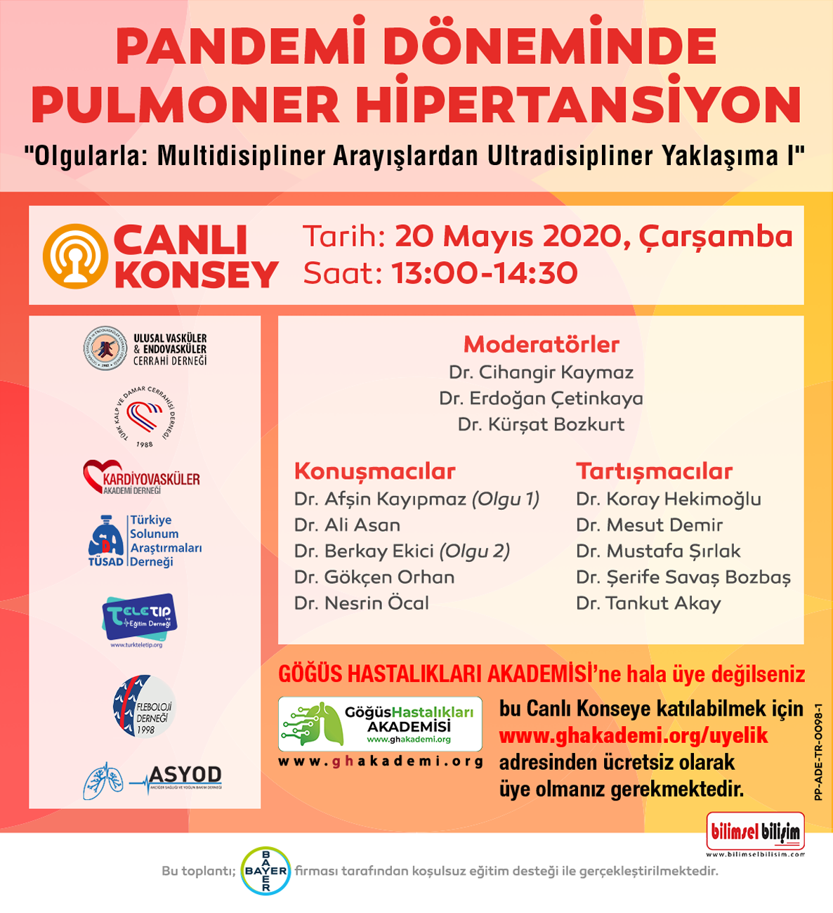 20 Mayıs 2020 Çarşamba günü Saat 13.00’de PANDEMİ DÖNEMİNDE PULMONER HİPERTANSİYON: “OLGULARLA: MULTİDİSİPLİNER ARAYIŞLARINDAN ULTRADİSİPLİNER YAKLAŞIMA I” Canlı Konseyi gerçekleştirilecektir.