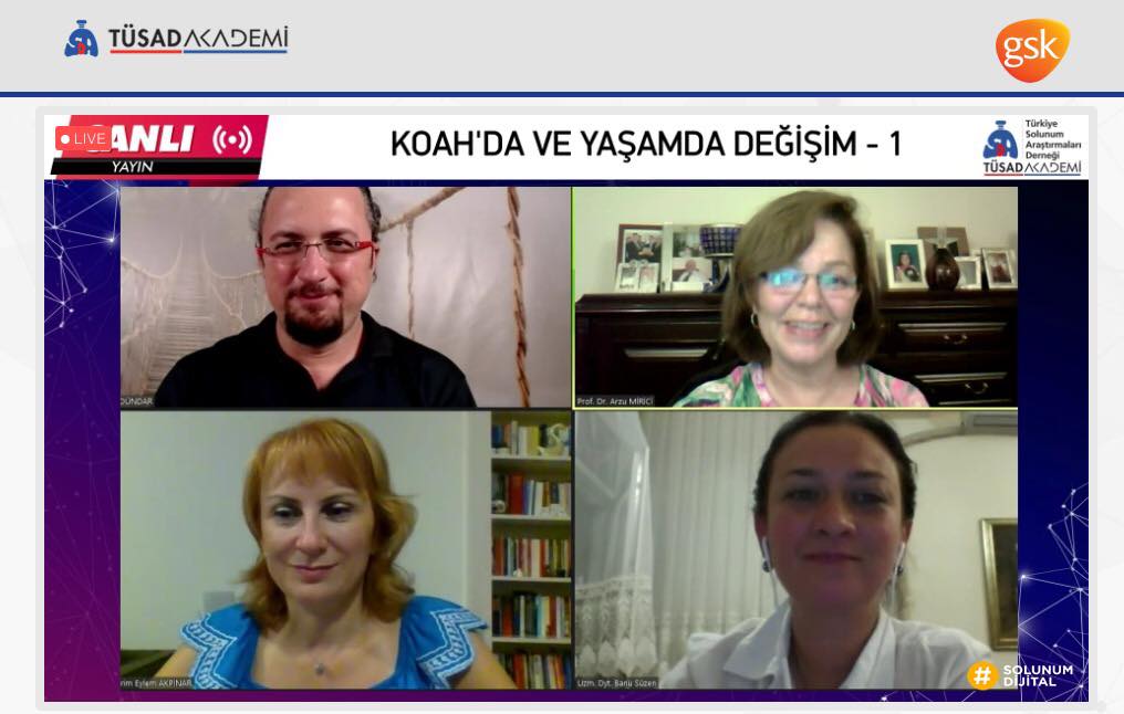 KOAH’da ve Yaşamda Değişim Webinar Serileri'nin ilki olan ve www.solunumdigital.com'da online olarak gerçekleştirilen ''KOAH Hastaları için beslenmede Neler Değişmeli?'' ve ''Bizim için değişim: Yeni Normale Adapte Olan Beyin'' konulu toplantımızda moderatörlük görevini üstlenen Prof. Dr. Arzu Mirici ve değerli yorumları ile konuşmacı olarak katılan Prof. Dr. Evrim Eylem Akpınar, Dyt. Banu Süzen ve Nöro Sağlık Beyin Araştırmaları Merkezi Kurucusu Dr. Kerem Dündar'a, ekran karşısında bizlere katılan meslektaşlarımıza bir kez daha teşekkür ederiz.