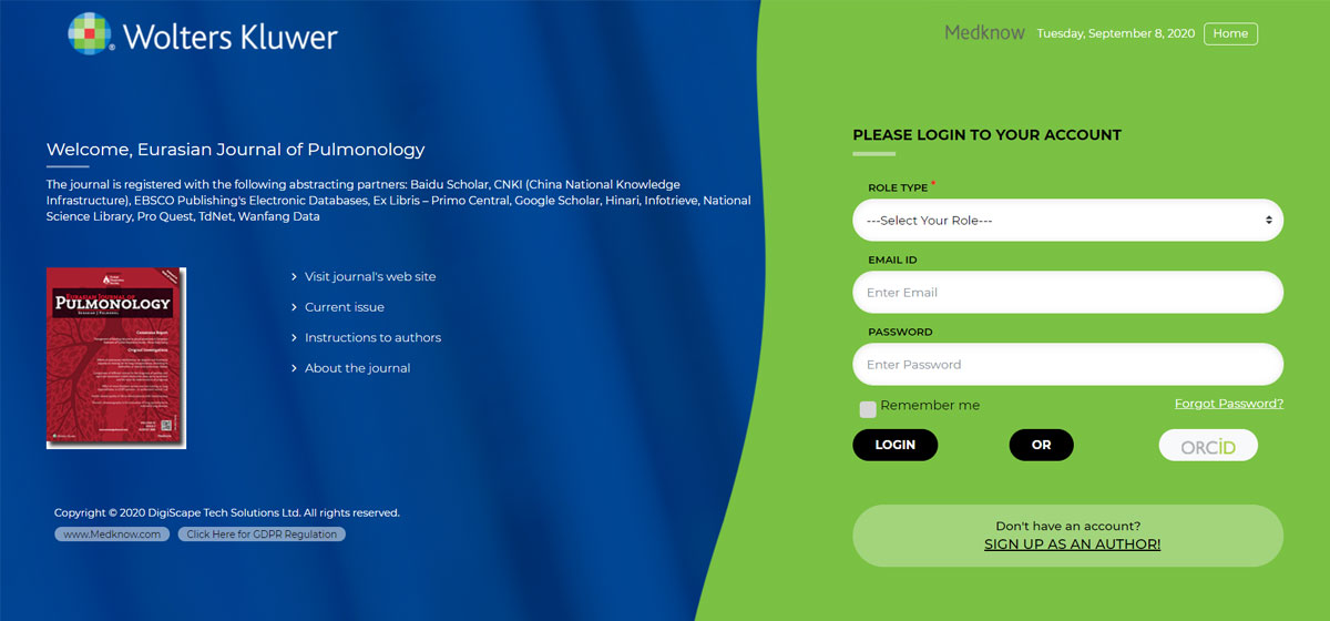 Türkiye Solunum Araştırmaları Derneği’nin süreli yayın organı olan “Eurasian Journal of Pulmonology”, TÜBİTAK Ulakbim, Türkiye Atıf Dizini, Index Copernicus, EBSCO, CINAHL, Proquest, DOAJ, HINARI ve Thomson Reuters’ın E-SCI indekslerinde yer almakta ve son üç yıldır dünyanın en geniş erişime açık yayıncı şirketi (open access publisher) olan Wolters Kluwer/ Medknow tarafından yayınlanmaktadır.