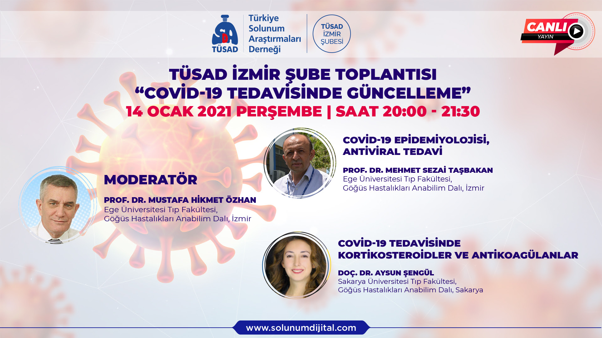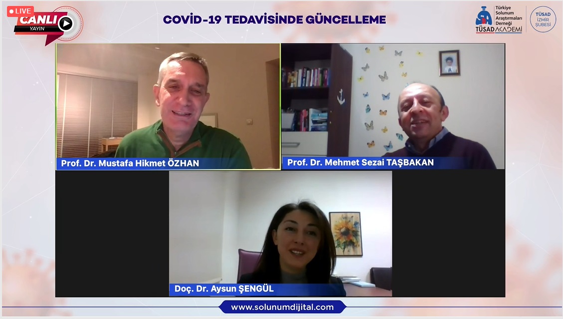 14 Ocak 2021 tarihinde TÜSAD İzmir Şubesi tarafından düzenlenen “COVİD-19 Tedavisinde Güncelleme“ toplantısı hekimlerin yoğun katılımıyla gerçekleştirilmiştir. Moderatörlük görevini üstlenen Prof. Dr. Mustafa Hikmet Özhan ’a, değerli yorumlarıyla konuşmacı olarak katılan Prof. Dr. Mehmet Sezai Taşbakan ve Doç. Dr. Aysun Şengül hocalarımıza, ekran karşısında bizlere katılan meslektaşlarımıza bir kez daha teşekkür ederiz.