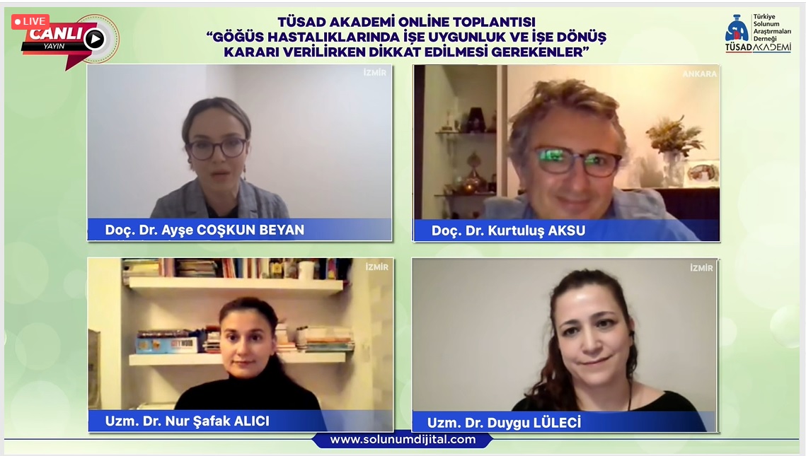 TÜSAD Akademi ve Mesleki ve Çevresel Solunum Hastalıkları-İş Sağlığı Çalışma Grubu'nun ortaklaşa düzenlediği,canlı yayın olarak gerçekleştirdiğimiz "Göğüs Hastalıklarında İşe Uygunluk ve İşe Dönüş Kararı Verilirken Dikkat Edilmesi Gerekenler" konulu toplantımızın gördüğü ilgiden dolayı siz değerli üyelerimize, moderatörlük görevini üstlenen Doç. Dr. Ayşe Coşkun Beyan'a, değerli yorumlarıyla konuşmacı olarak katılan Doç. Dr. Kurtuluş Aksu, Uzm. Dr. Nur Şafak Alıcı ve Uzm. Dr. Duygu Lüleci hocalarımıza, ekran karşısında bizlere katılan meslektaşlarımıza bir kez daha teşekkür ederiz.