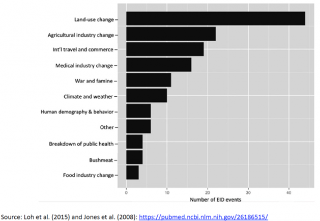 Arazi kullanımı değişikliğinin EID’lerin en yaygın tetikleyicisi olduğu gösterilmiştir(Şekil 1). Özellikle tropikal ormanların kenar bölgeleri, yeni insan virüsleri için önemli bir bulaşma kaynağı. İnsanlar tarım, hayvancılık, kereste ve diğer doğal ürünlerin üretimi ve ticareti için ormanları kesip habitat parçalanmasına neden oldukça, “kenar etkisi” adı verilen orman kenarlarının uzunluğu da vahşi hayvan kaynaklı hastalıkların bulaşma riskiyle birlikte artmaktadır.