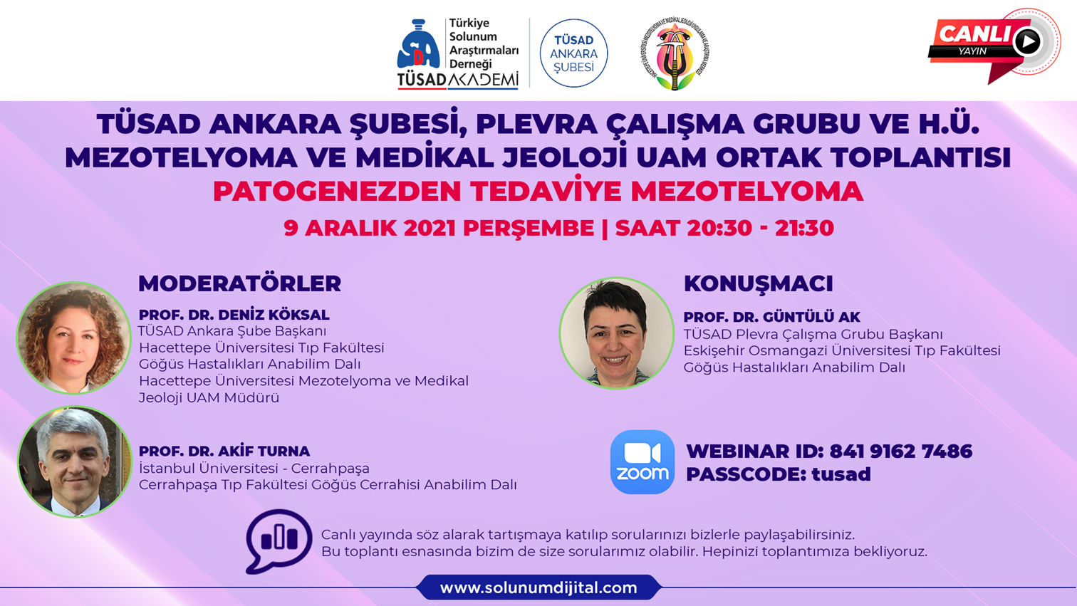 TÜSAD Akademi, TÜSAD Ankara Şubesi, Plevra Çalışma Grubu ve Hacettepe Üniversitesi Mezotelyoma ve Medikal Jeoloji UAM'ın ortak düzenlediği “Patogenezden Tedaviye Mezotelyoma” konulu webinarı gerçekleştirdik. Moderatörlük görevini üstlenen hocalarımız Prof.Dr. Deniz Köksal ve Prof.Dr. Akif Turna'ya, konuyu detaylarıyla ele alan konuşmacımız Prof.Dr. Güntülü Ak hocamıza, sorularıyla toplantımızı renklendiren tüm izleyicilerimize ve değerli yorumlarıyla tartışmalara katkı sağlayan hocalarımıza teşekkür ederiz.