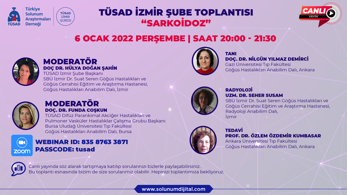 TÜSAD Akademi ve TÜSAD İzmir Şubesinin ortaklaşa düzenlediği “Sarkoidoz'' konulu toplantımızın gördüğü yoğun ilgiden dolayı siz değerli üyelerimize, moderatörlük görevini üstlenen Doç.Dr. Hülya Doğan Şahin ve Doç.Dr. Funda Coşkun'a değerli yorumlarıyla konuşmacı olarak katılan Prof.Dr. Özlem Özdemir Kumbasar, Doç.Dr. Nilgün Yılmaz Demirci ve Uzm.Dr. Seher Susam hocalarımıza, ekran karşısında bizlere katılan meslektaşlarımıza bir kez daha teşekkür ederiz.