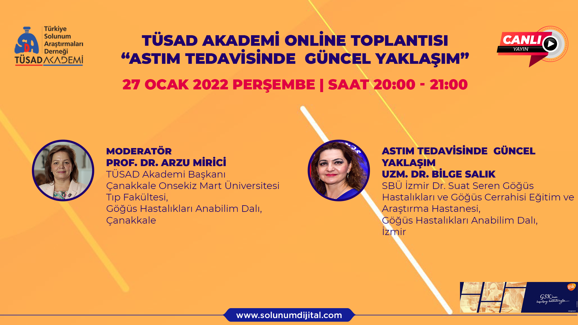 TÜSAD Akademi tarafından canlı yayın olarak gerçekleştirdiğimiz “Astım Tedavisinde Güncel Yaklaşım'' konulu toplantımızın gördüğü ilgiden dolayı siz değerli üyelerimize, moderatörlük görevini üstlenen Prof. Dr. Arzu Mirici'ye değerli yorumlarıyla konuşmacı olarak katılan Uzm. Dr. Bilge Salık hocamıza, ekran karşısında bizlere katılan meslektaşlarımıza bir kez daha teşekkür ederiz.