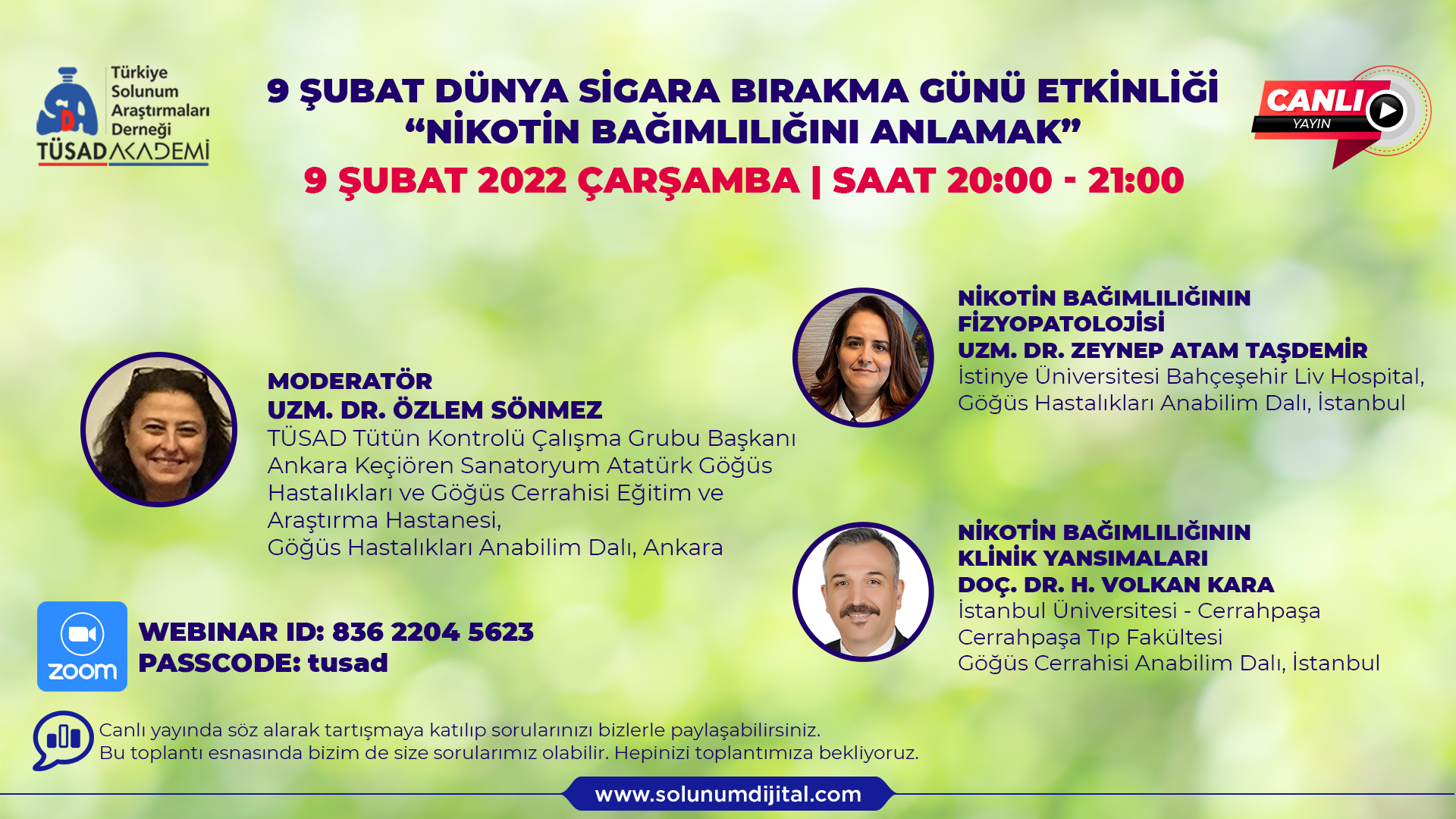 TÜSAD Akademi ve TÜSAD Tütün Kontrolü Çalışma Grubu'nun ortaklaşa düzenlediği,Dünya Sigara Bırakma Günü Etkinliği kapsamında canlı yayın olarak gerçekleştirdiğimiz “Nikotin Bağımlılığını Anlamak'' konulu toplantımızın gördüğü ilgiden dolayı siz değerli üyelerimize, moderatörlük görevini üstlenen Uzm.Dr. Özlem Sönmez'e değerli yorumlarıyla konuşmacı olarak katılan Doç. Dr. H.Volkan Kara ve Uzm. Dr. Zeynep Atam Taşdemir hocalarımıza, ekran karşısında bizlere katılan meslektaşlarımıza bir kez daha teşekkür ederiz.