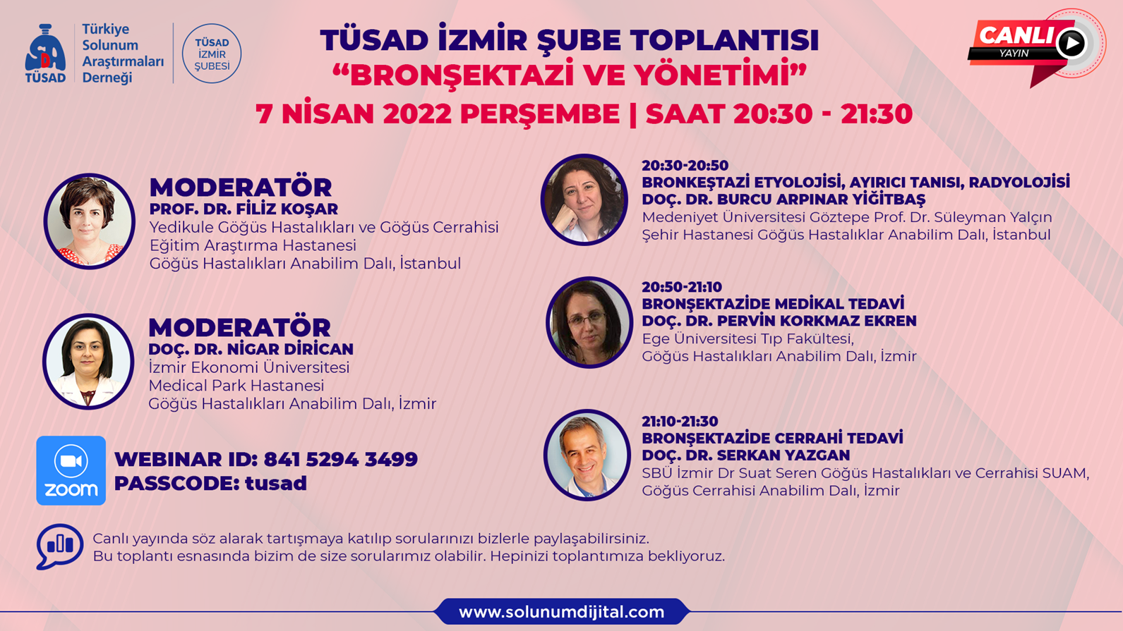 TÜSAD İzmir Şubesi tarafından düzenlenen “Bronşektazi ve Yönetimi“ toplantısı hekimlerin yoğun katılımıyla gerçekleştirilmiştir. Moderatörlük görevini üstlenen Prof. Dr. Filiz Koşar ve Doç.Dr. Nigar Dirican'a, değerli yorumlarıyla konuşmacı olarak katılan Doç. Dr. Burcu Arpınar Yiğitbaş, Doç.Dr. Pervin Korkmaz Ekren ve Doç. Dr. Serkan Yazgan hocalarımıza, ekran karşısında bizlere katılan meslektaşlarımıza bir kez daha teşekkür ederiz.