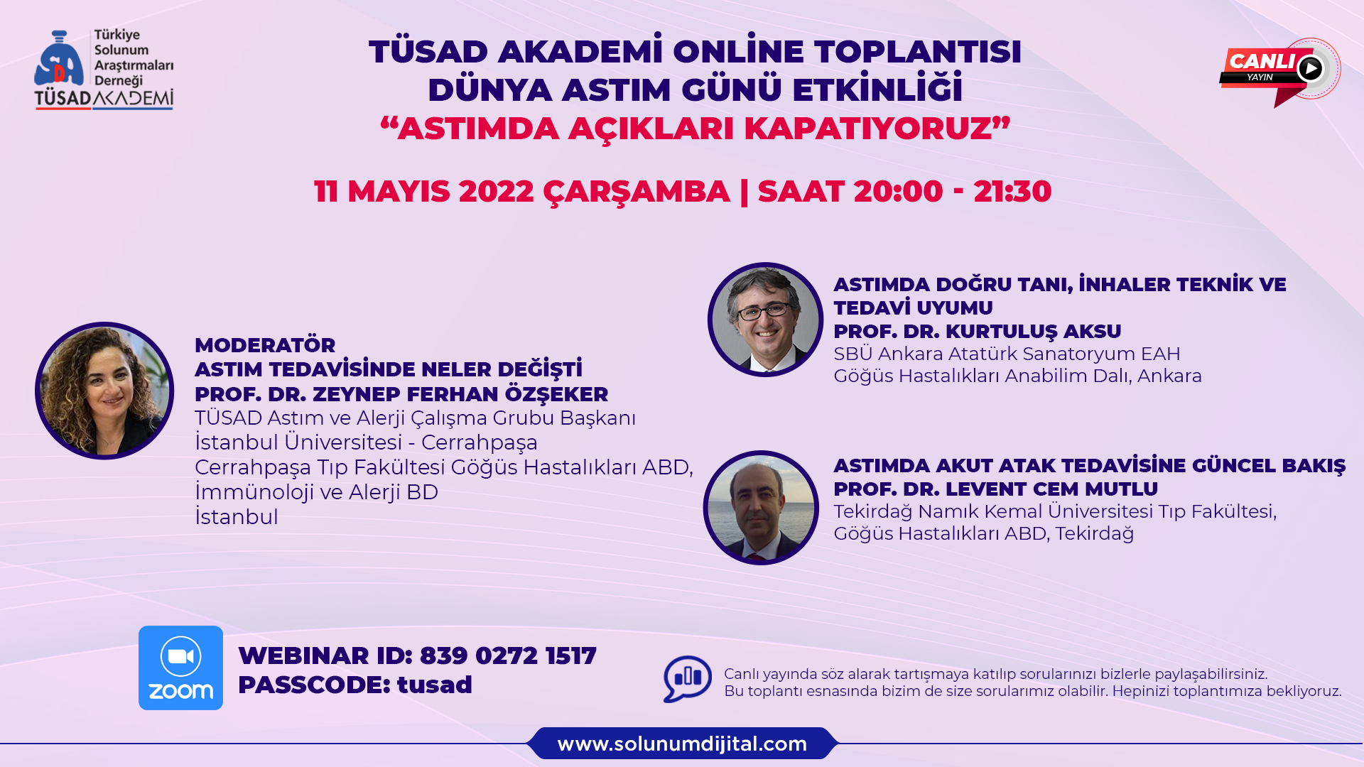 TÜSAD Akademi ve TÜSAD Astım ve Alerji Çalışma Grubunun Dünya Astım günü sebebi ile ortaklaşa düzenlediği “Astımda Açıkları Kapatıyoruz.” konulu toplantımızın gördüğü ilgiden dolayı siz değerli üyelerimize, moderatörlük görevini üstlenen Prof.Dr. Ferhan Özşeker'e değerli yorumlarıyla konuşmacı olarak katılan Prof.Dr. Kurtuluş Aksu ve Prof. Dr. Levent Cem Mutlu hocalarımıza, ekran karşısında bizlere katılan meslektaşlarımıza bir kez daha teşekkür ederiz.