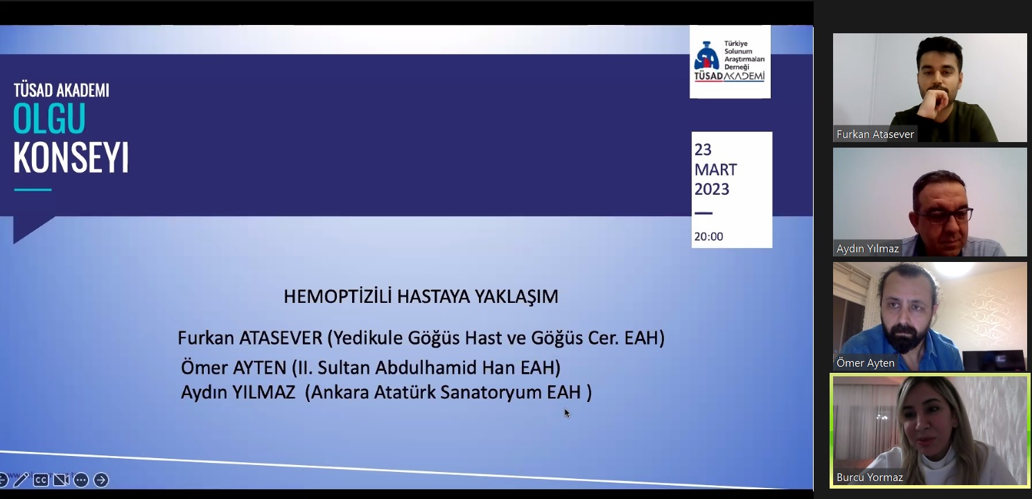 TÜSAD Akademi, GEAK ve Girişimsel Pulmonoloji Çalışma Grubunun ortaklaşa düzenlediği, canlı yayın olarak gerçekleştirdiğimiz ''Hemoptizi'' konulu Olgu Konseyine göstermiş olduğunuz ilgiden dolayı siz değerli üyelerimize, moderatörlük görevini üstlenen Prof. Dr. Aydın Yılmaz'a değerli yorumlarıyla konuşmacı olarak katılan Doç. Dr. Ömer Ayten ve Dr. Furkan Atasever'e ekran karşısında bizlere katılan meslektaşlarımıza bir kez daha teşekkür ederiz.
