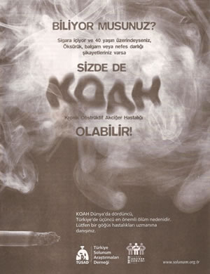 Dünya Sağlık Örgütü verilerine göre dünya genelinde 2000’li yıllarda en önemli 4. ölüm nedeni olarak saptanan ve 2020 yılında da 3. sıraya çıkacağı öngörülen ve dünyada 200-300 milyon, Türkiye'de 3-4 milyon hastayı ilgilendiren KOAH'a yönelik olarak Türkiye Solunum Araştırmaları Derneği'nin yaklaşık bir yıldır yürütme olduğu "Toplumda Farkındalığı Artırma" faaliyetleri çerçevesinde yeni bir medya kampanyası başlatmış bulunuyoruz. Bu kampanya döneminde, her haftasonu yüksek tirajlı bir gazetede 1/4 tamsayfa boyutunda bir duyuru yayınlanacak ve KOAH gerçeğine dikkat çekilmeye çalışılacaktır. Her yıl 40 binin üzerinde vatandaşımızın KOAH nedeni ile hayatını kaybettiği tahmin edilmektedir. Daha çok ileri yaşlarda (60 yaşından sonra) ortaya çıkan bu hastalığın Avrupa ve Amerika’ya göre belirgin şekilde daha genç bir nüfusa sahip olmasına rağmen Türkiye’de bu kadar ön planda olması ancak hastalar ve toplum tarafından çok seyrek görülen bazı hastalıklar kadar bilinmemesi son derece düşündürücüdür. Ölümlere yol açmasının yanı sıra tüm dünyada önemli bir sakat bırakma nedeni de olan KOAH'ın tedavi masrafları yönünden toplam sağlık bütçeleri içerisinde %4 gibi önemli bir yere sahip olduğu da unutulmamalıdır. Bu nedenle hastaların " Doğru tanı ve tedavi" olanağını sağlayabilecek merkezlere başvurmalarının sağlanması da sağlık ekonomisi açısından büyük önem taşımaktadır. Yürüttüğümüz projelerin önemli bir ayağını da bu hedefe yönelik çalışmalar oluşturmaktadır ve oluşturacaktır.