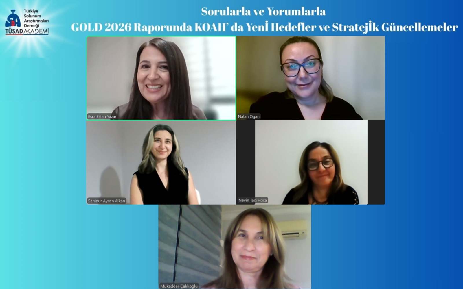 TÜSAD Akademi ve KOAH Çalışma Grubu tarafından hazırlanan "Sorularla ve Yorumlarla GOLD 2026 Raporunda KOAH’da Yeni Hedefler ve Stratejik Güncellemeler" konulu webinara göstermiş olduğunuz yoğun ilgiden dolayı siz değerli üyelerimize, moderatörlük görevini üstlenen Prof. Dr. Esra Ertan Yazar'a, değerli yorumlarıyla konuşmacı olarak katılan Prof. Dr. Mukadder Çalıkoğlu, Doç. Dr. Nevin Taci Hoca, Doç. Dr. Nalan Ogan ve Dr. Öğr. Üyesi Sahinur Aycan Alkan'a, ekran karşısında soruları ile bizlere katılan meslektaşlarımıza bir kez daha teşekkür ederiz.